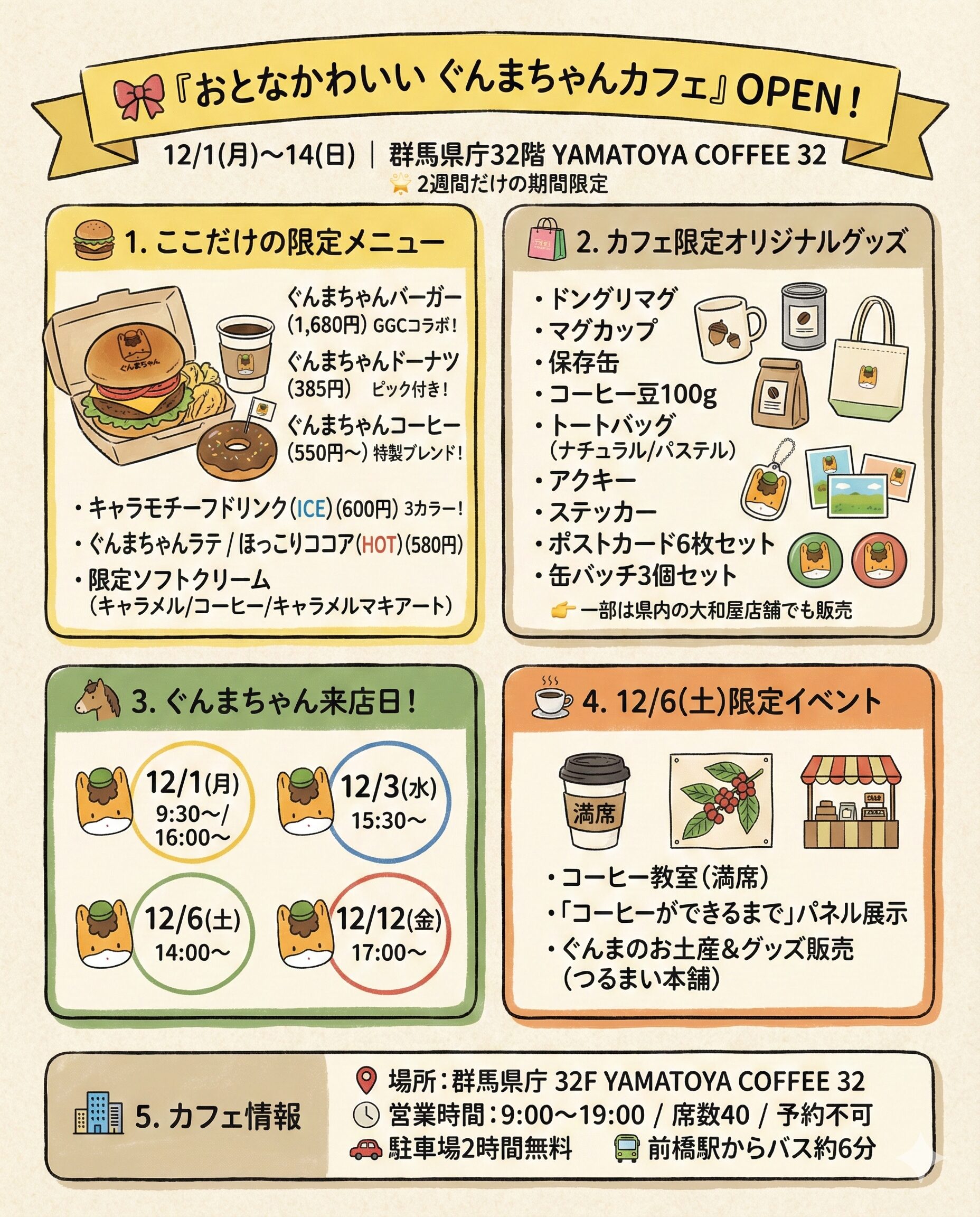 2025年12月1日(月)~14日(日)の2週間、群馬県庁32階「YAMATOYA COFFEE 32」に、期間限定『ぐんまちゃんカフェ』がオープンします。