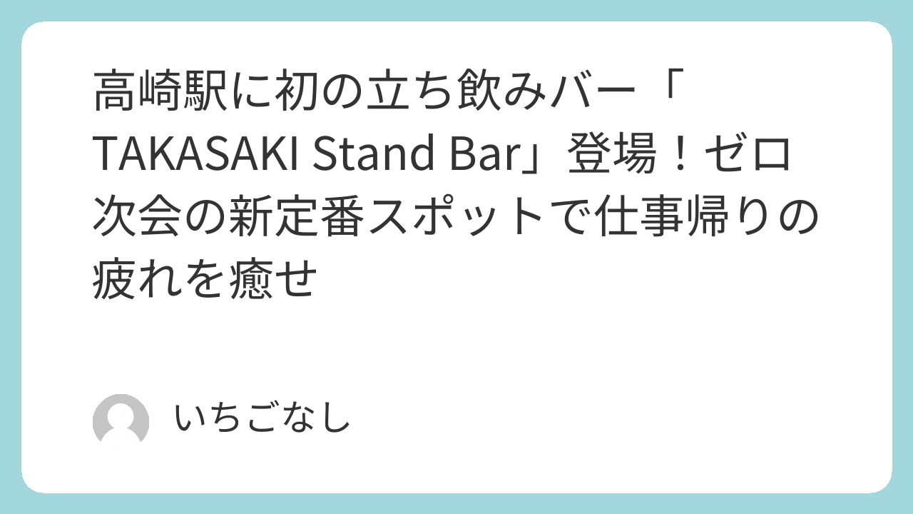 仕事が終わったけど、まっすぐ帰るのは物足りない。でも居酒屋で長時間飲むほどでもない…そんな絶妙なタイミングで利用したい「ちょい飲み」スポットが、ついに高崎にも誕生する。JR高崎駅の東西自由通路で10月14日〜16日に開催される「TAKASAKI Stand Bar」は、仕事帰りのビジネスパーソンや、新しい体験を求める若者のための実験的なイベントだ。地産地消のグルメと生ライブが楽しめる3時間限定の立ち飲み空間で、高崎の夜に新しい風を吹き込もう 🍻