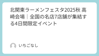 イベント 北関東ラーメンフェスタ2025秋 高崎会場|全国の名店7店舗が集結する4日間限定イベント 高崎駅東口のLABI1ガーデンで、10月10日から13日までの4日間、全国のラーメン店が集結する🍜札幌、仙台、東京、大阪から選りすぐりの実力店が参戦。そして地元・群馬からは伊勢崎と高崎の個性派が名乗りを上げる。1杯1,000円のチケット制で... 2025.10.07 イベント